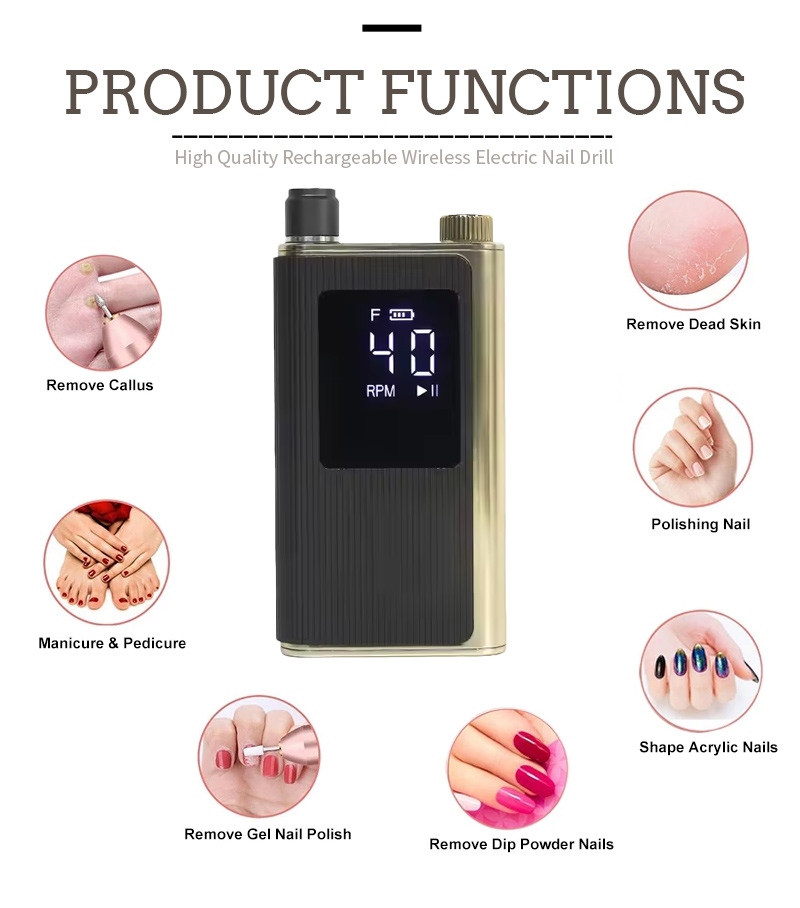 Bu 40.000 rpm yüksək sürətli peşəkar dırnaq matkapının displey dizaynında cəmi bir düymə ilə aktivləşdirmə üçün açma/söndürmə açarı və irəli/geri fırlanma, aşağıda tez doldurma yuvası, yuxarıda dəyişdirilə bilən qazma yuvası və müxtəlif ehtiyacları ödəmək üçün üç mövqedə tənzimlənən sürət var.