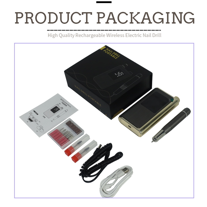 Bu 40.000 rpm yüksək sürətli peşəkar dırnaq qazma paketinin tərkibinə zımpara qələmi məhsulu, USB şarj kabeli, məhsulun təlimat kitabçası və yüngül və daşına bilən qutu daxildir.