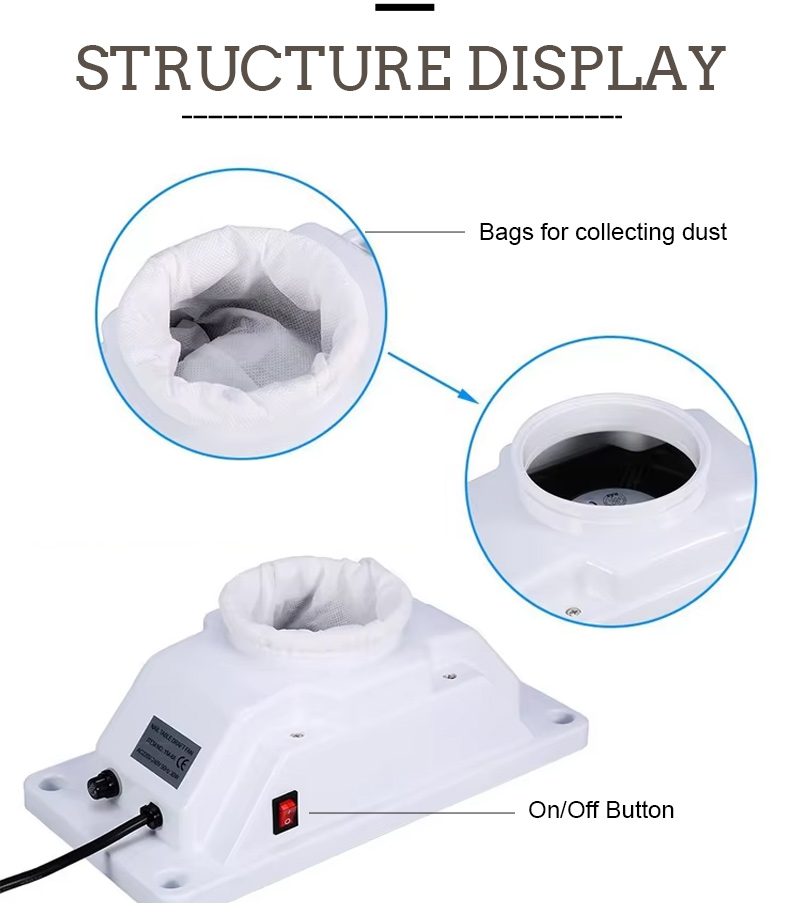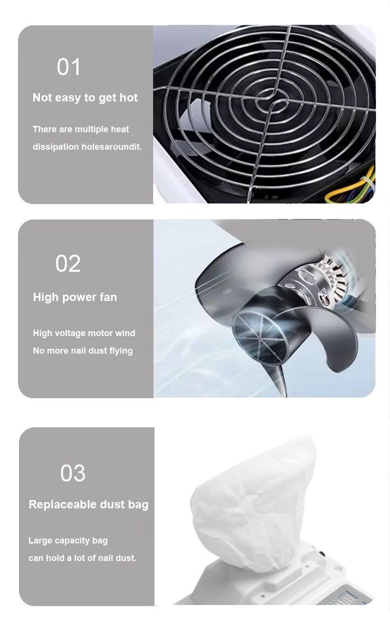Məhsullar dırnaq zibilinin güclü adsorbsiyası toz sızdırmır, tezgahı təmiz və səliqəli saxlayır, sürətli tozsoran toz sızdırmaz, yüksək güc daha səmərəlidir.