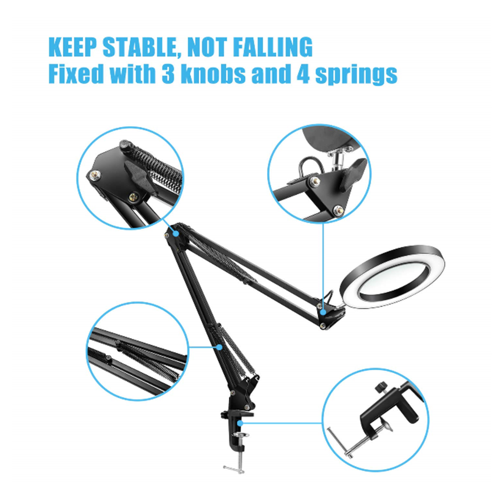 Bu qatlanan 360 dərəcə fırlanan böyüdücü masa lampası zərif və zərif bir dizayn təqdim edir. Rahat, parlaq işıqlı işıq üçün şəfəqin yumşaq, təbii işığını simulyasiya edən gözlərdə incə işığı asandır. Tatuizasiya, tikmə və dırnaq sənəti də daxil olmaqla birdən çox tətbiq üçün uyğundur.