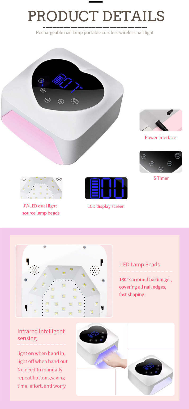 Məhsul büzüşmədən hətta yapışqan qurumasını təmin edir. İkili işıq mənbələri əl rəngsizləşməsi və göz gərginliyinin qarşısını almaq üçün zərif istilik, həm əllərinizə, həm də ayaqları üçün uyğun sürətli qurutma nəticələrini təqdim edir.