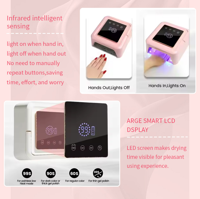 Bu yüksək keyfiyyətli gel dırnaq lakı tez quruyan lampa yapışqanın büzülmədən bərabər qurumasını təmin edir. Onun ikiqat işıq mənbələri əllərin rənginin dəyişməsinin və gözlərin yorğunluğunun qarşısını almaq üçün yumşaq isitmə təmin edir, həm əllər, həm də ayaqlar üçün uyğundur və olduqca sürətli qurutma nəticələri verir.