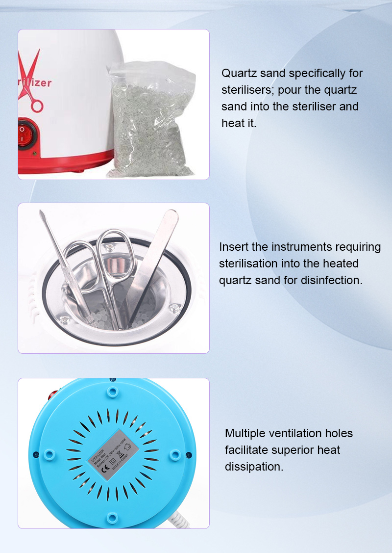 Bu sterilizator, ilk növbədə dezinfeksiya üçün yüksək temperaturdan istifadə edərək istilik halqası ilə istilik yaradır.