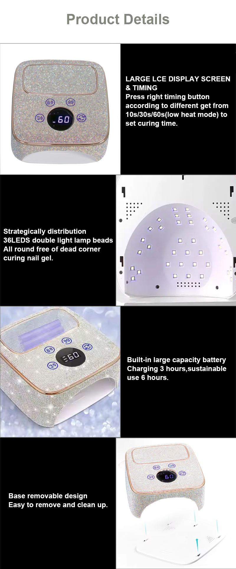 2)Yenidən doldurulan dırnaq qurutma lampası Ürək şəkli 72W yüksək dəqiqlikli LCD ekran, müstəqil güc ekranı olan, istənilən vaxt güc istifadəsini müşahidə edə bilərsiniz, istənilən vaxt çıxma problemini həll edə bilərsiniz.
