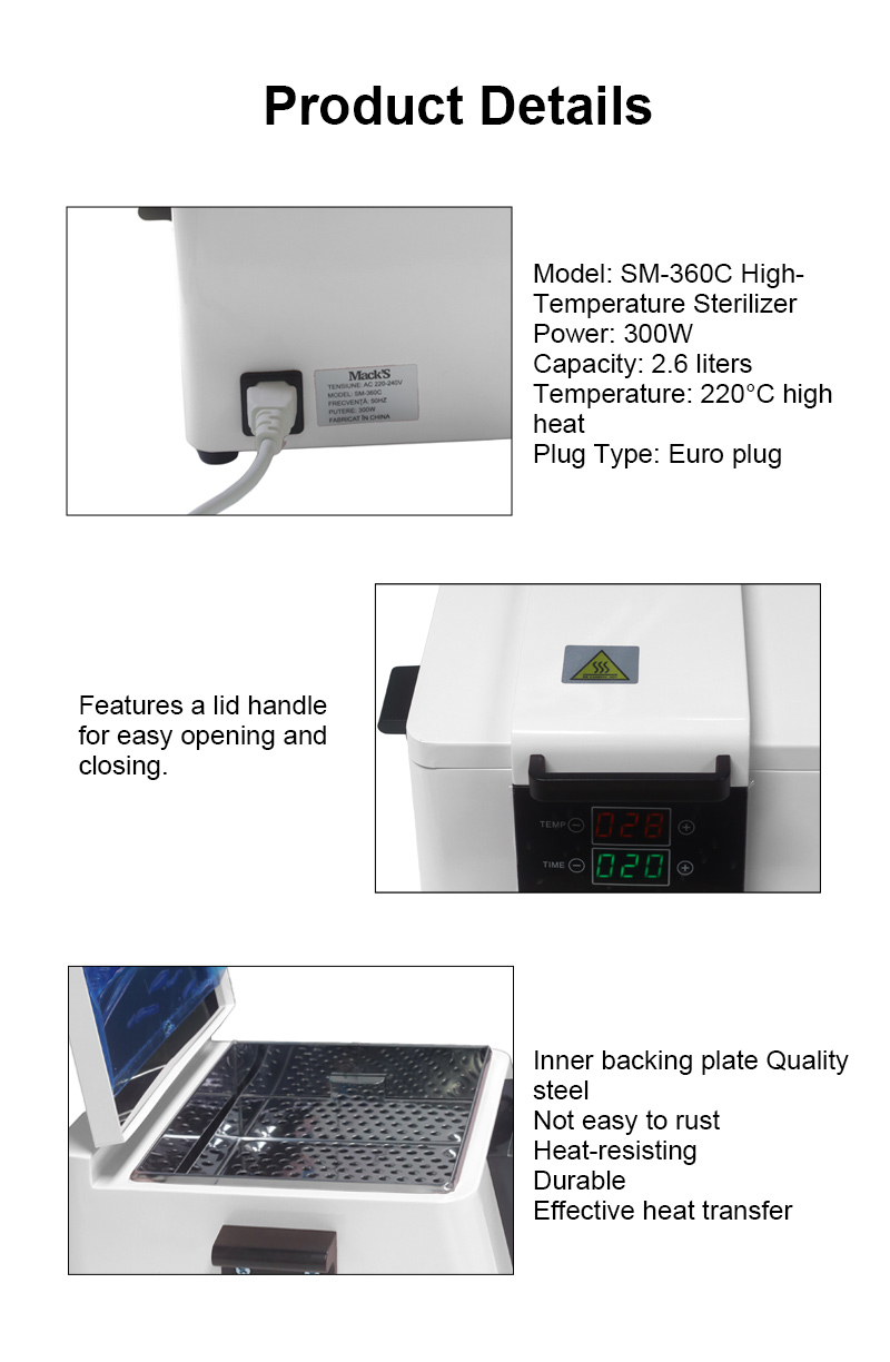 Bu sterilizator, ilk növbədə dezinfeksiya üçün yüksək temperaturdan istifadə edərək istilik halqası ilə istilik yaradır.