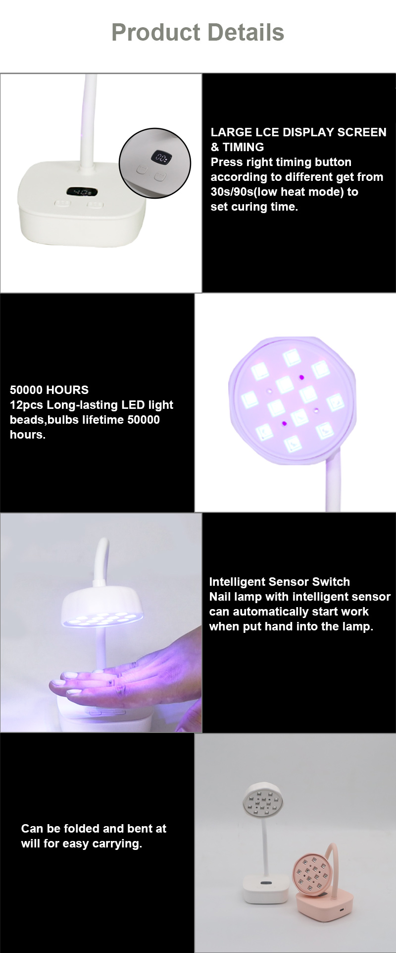 Məhsul büzüşmədən hətta yapışqan qurumasını təmin edir. İkili işıq mənbələri əl rəngsizləşməsi və göz gərginliyinin qarşısını almaq üçün zərif istilik, həm əllərinizə, həm də ayaqları üçün uyğun sürətli qurutma nəticələrini təqdim edir.