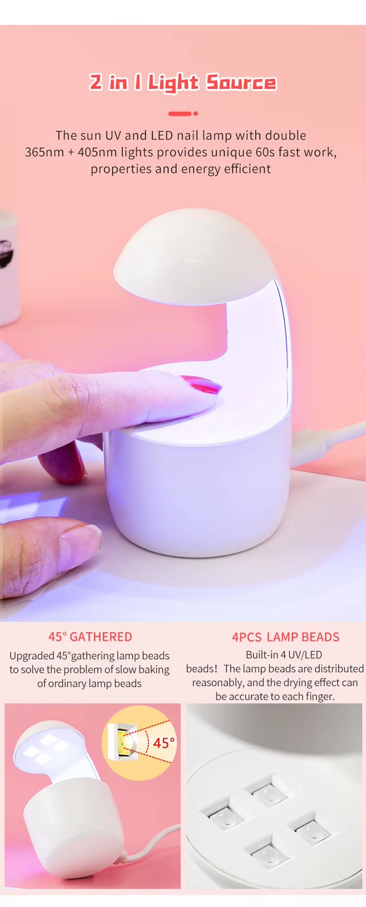 1)8W doldurulan simsiz bir lampası, məhsulun 4 UV / LED idxal olunan böyük çip lampası muncuqu, rəngli dırnaq lakı qurutmaq üçün 8 saniyə effektivliyinin 1 ən yaxşı 5, dırnaq lakı qatını qurutmaq üçün 12 saniyə. Lampa muncuqları dalğa uzunluğu (365 + 405nm), ölü olmayan yüksək güc çörək yapışqanları.