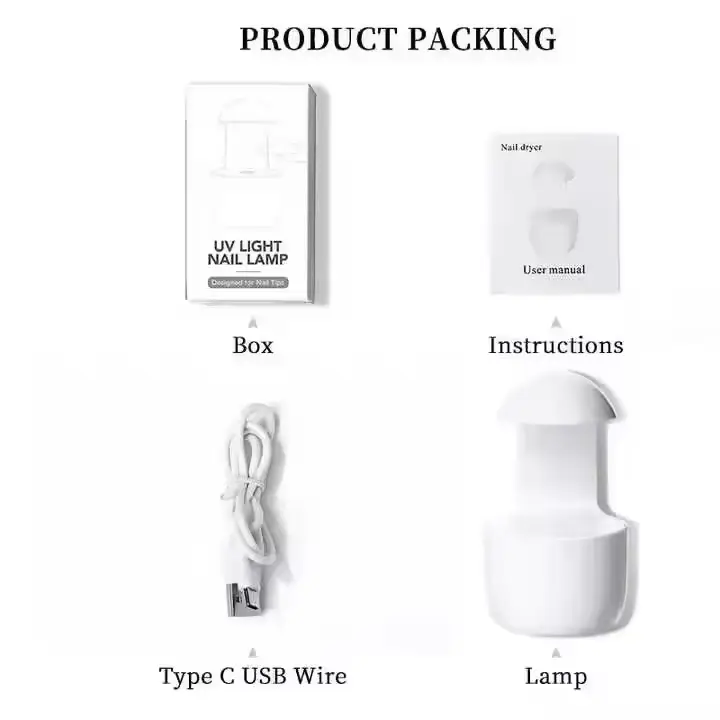 8W şarj edilə bilən simsiz bir lampa lampası məhsulun paket məzmununu USB şarj kabeli, bir söz manikür lampası, istifadəçi təlimatı və kiçik və incə bir qutuya malikdir. Məhsulu zərərdən qorumaq üçün qutu möhkəmdir.