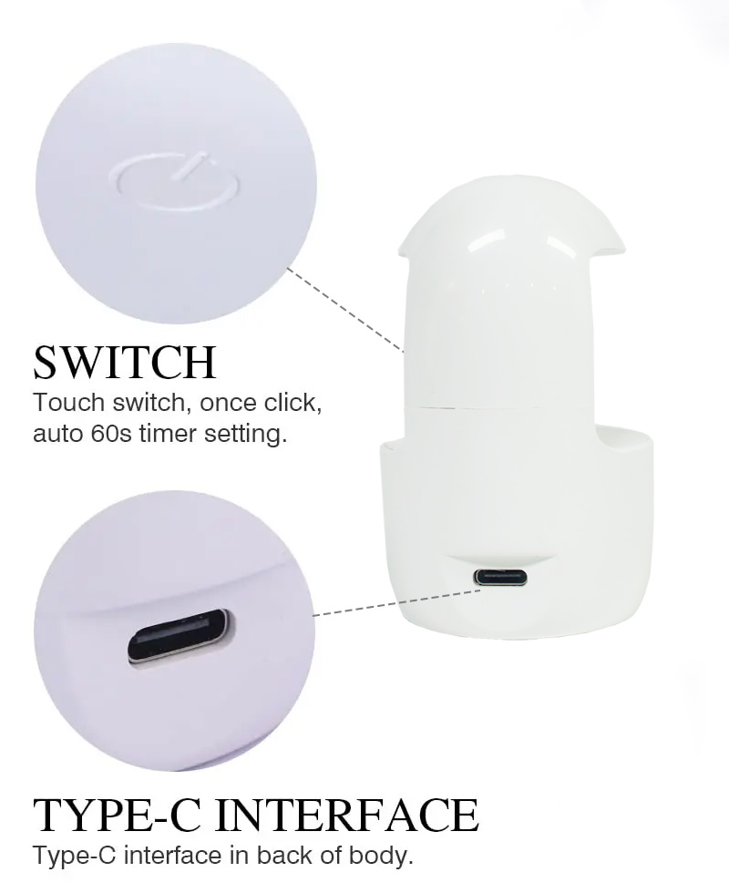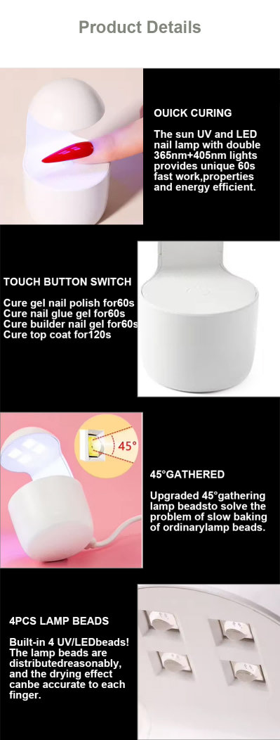 Mini Tək Barmaqlı Dırnaq Lampası yapışqanın büzülmədən bərabər qurumasını təmin edir. Onun ikiqat işıq mənbələri əllərin rənginin dəyişməsinin və gözlərin yorğunluğunun qarşısını almaq üçün yumşaq isitmə təmin edir, həm əllər, həm də ayaqlar üçün uyğundur və olduqca sürətli qurutma nəticələri verir.