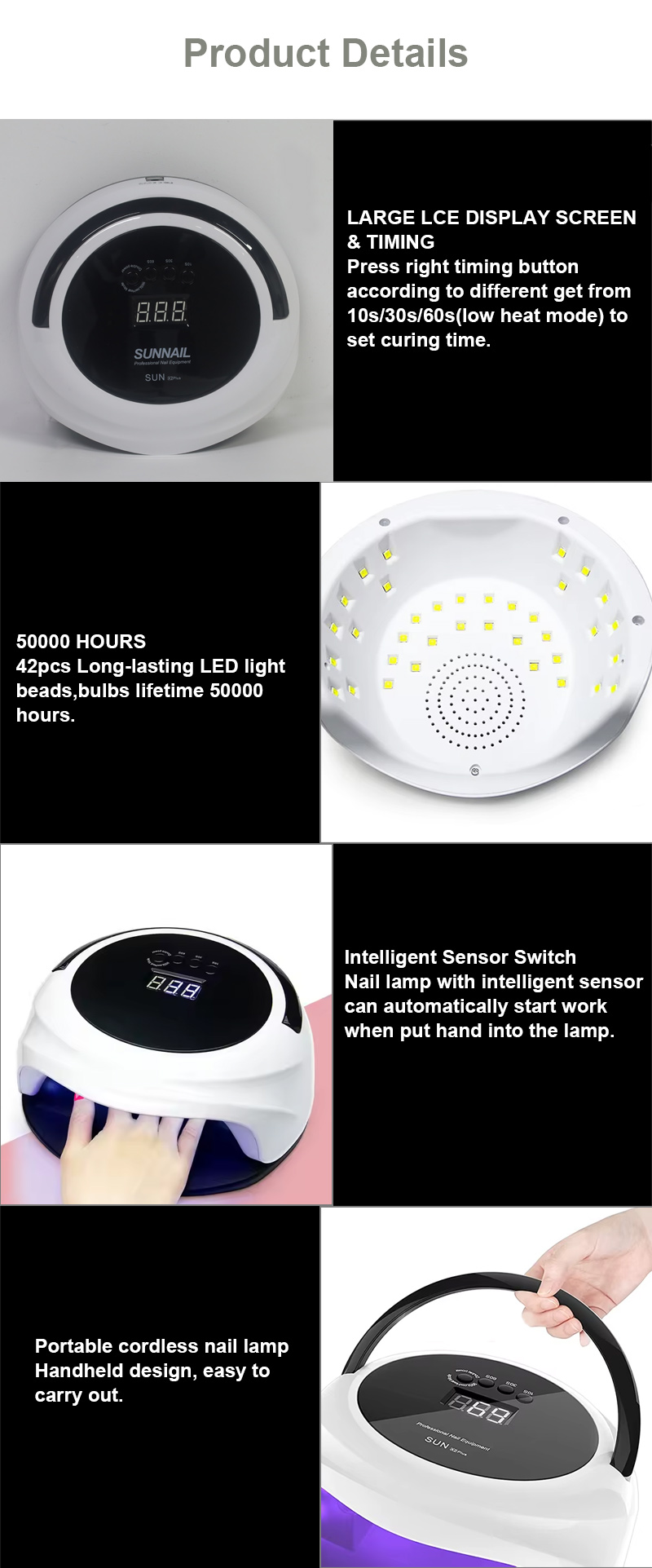 Avtomatik sensor funksiyası olan dırnaq qurutma lampası əllər yaxınlaşdıqda avtomatik işıqlanan və əllər uzaqlaşdıqda sönən infraqırmızı smart sensor texnologiyasına malikdir - düymələri təkrar basmaq əngəlini aradan qaldırır, vaxta və səyə qənaət edir. Yüksək güclü çörəkçilik yapışqanı uzun gözləməyə ehtiyac duymur, həm vaxta, həm də səyə qənaət edir.