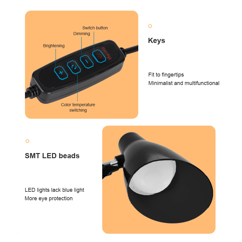 Məhsulun ölçüsü 30sm*28sm*14sm uzunluğunda, yığcam və yüngül, 90 dərəcə sərbəst tənzimlənən hündürlük, işığı tənzimləmək üçün 180 dərəcə fırlanma, yataq otağı, iş otağı, yataq otağı və digər səhnələr üçün uyğundur.