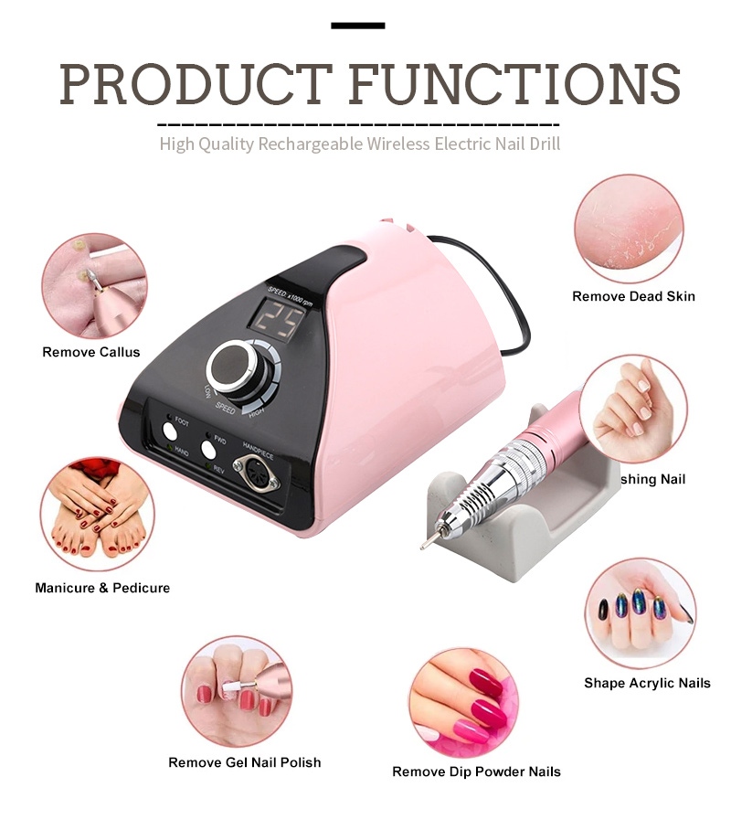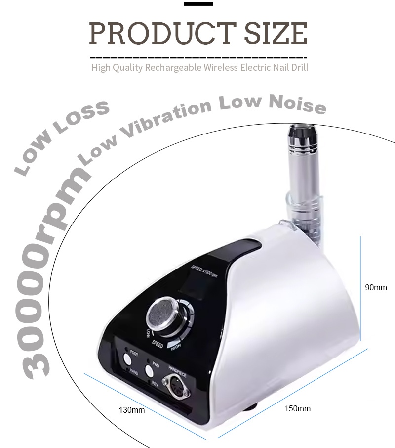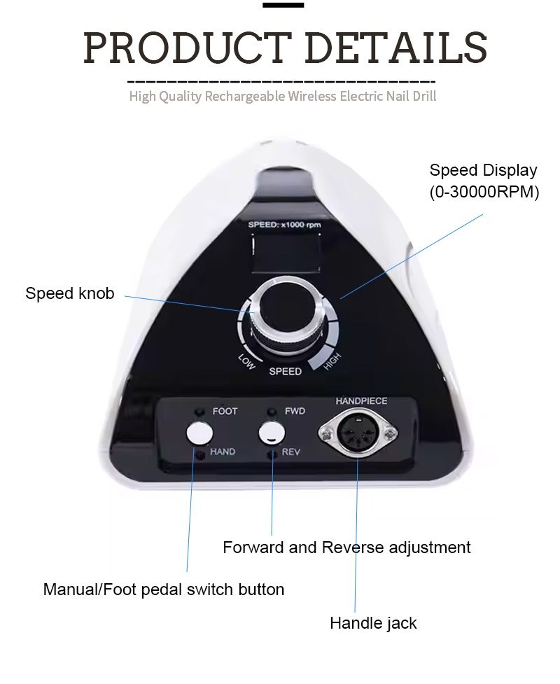 Bu peşəkar portativ dırnaq qazma maşınının ekran dizaynı 35.000 rpm-ə malikdir, cəmi bir düymə ilə aktivləşdirmə üçün bir açma/söndürmə açarı və irəli/geri fırlanma, aşağıda tez doldurma yuvası, yuxarıda dəyişdirilə bilən qazma yuvası və müxtəlif ehtiyacları ödəmək üçün üç mövqeli tənzimlənən sürətə malikdir.