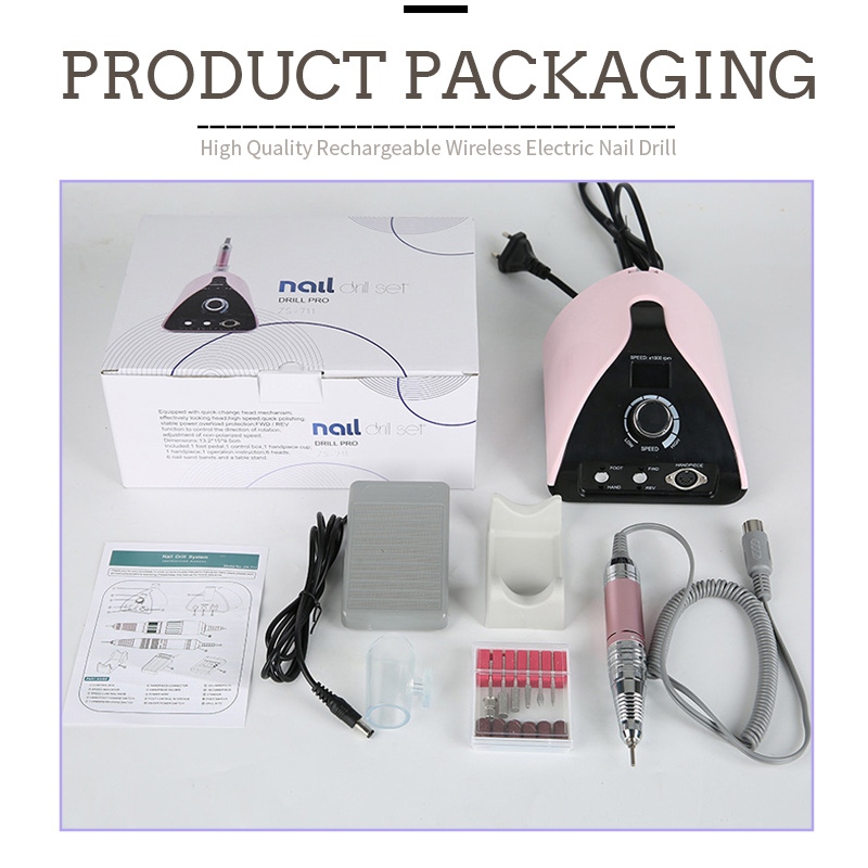 Bu peşəkar portativ dırnaq qazma maşınının məzmunu 35.000 rpm paketində zımpara qələmi məhsulu, USB şarj kabeli, məhsulun təlimat kitabçası və yüngül və portativ qutu var.