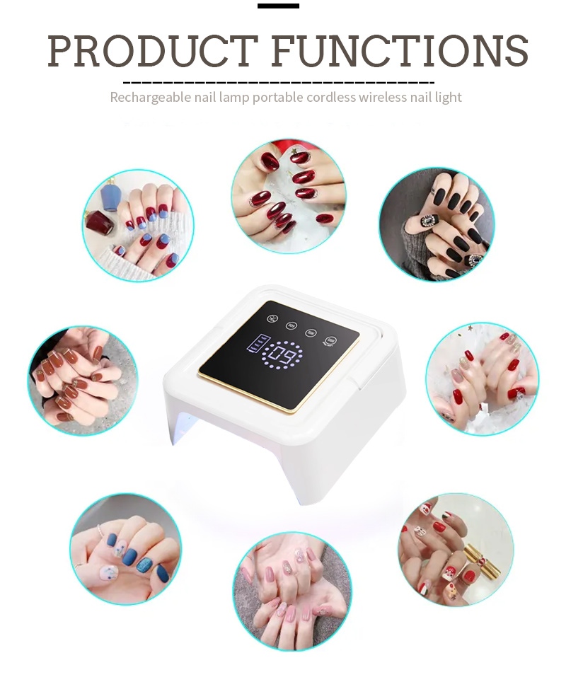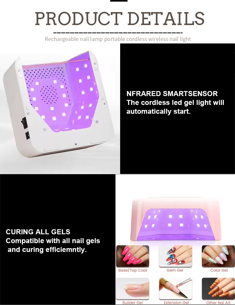 Kvadrat dırnaq qurutma lampası yapışqanın büzülmədən bərabər qurumasını təmin edir. Onun ikiqat işıq mənbələri əllərin rənginin dəyişməsinin və gözlərin yorğunluğunun qarşısını almaq üçün yumşaq isitmə təmin edir, həm əllər, həm də ayaqlar üçün uyğundur və olduqca sürətli qurutma nəticələri verir.