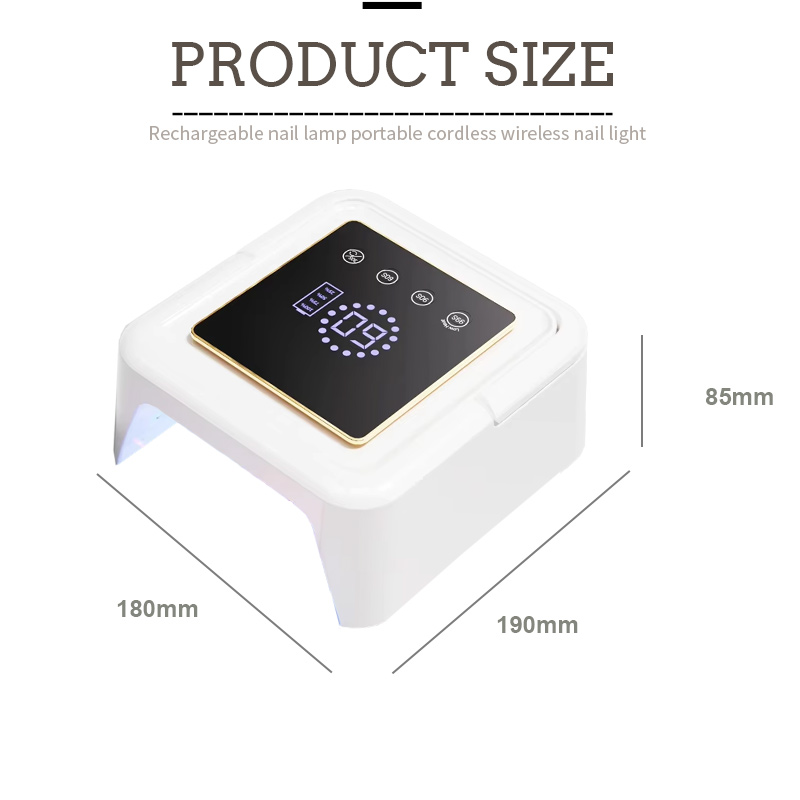 Kvadrat dırnaq qurutma lampasının ölçüləri uzunluğu 180 mm, eni 190 mm və hündürlüyü 85 mm olmaqla, böyük tutumu və həm əlləri, həm də ayaqları istifadə etmək qabiliyyətinə malikdir ki, bu da çox rahatdır.