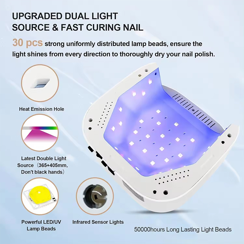 Məhsul 36 led/uv ikiqat işıq mənbəyi lampa muncuq paylama vahidliyinə malikdir, yapışqan büzülmədən bişirmə yapışqanının vahidliyinə, ikiqat işıq mənbəyi yumşaq çörəkçilik yapışqanına qarşı qara ələ malikdir, gözlərə, əllərə və ayaqlara zərər vermir, tez quruyan effekti var. yüksək.