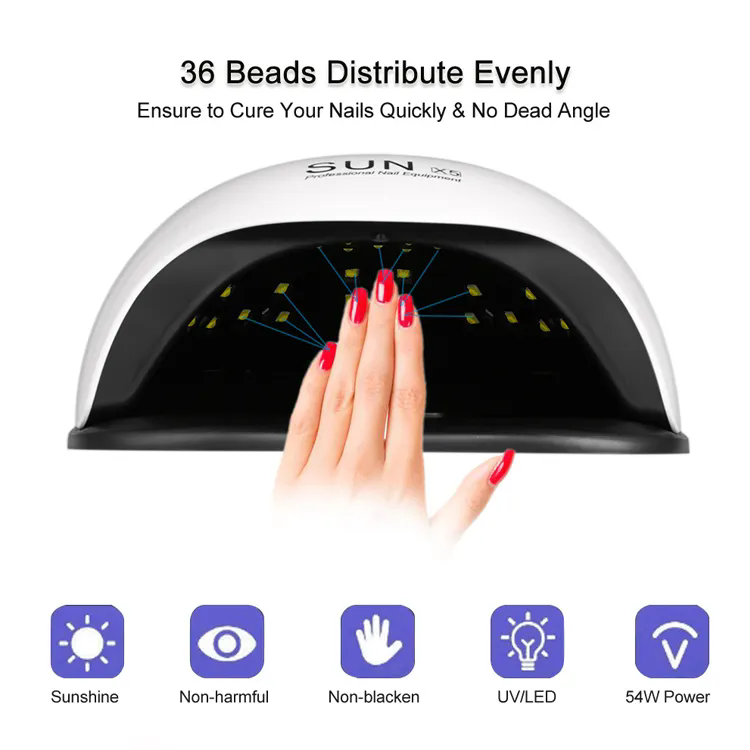 2)Təkrarlanan dırnaq lak lampası 54 vatt doldurulan məhsulu 36 lampa muncuq (365nm + 405nm) UV / LED, hətta yüngül müalicəvi uv yapışqan, dırnaq lakı quruyur.