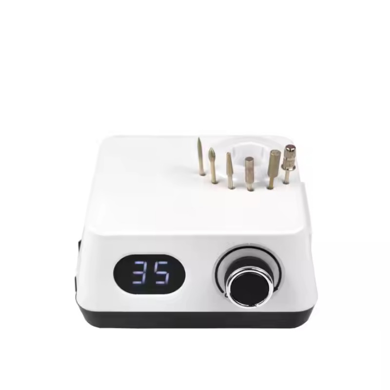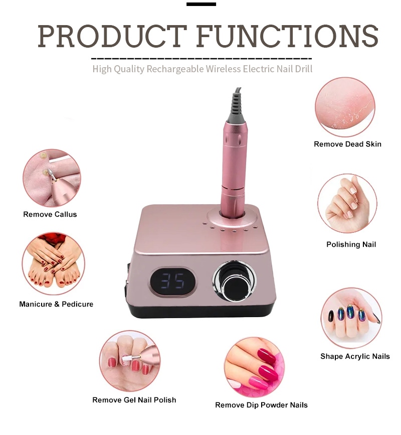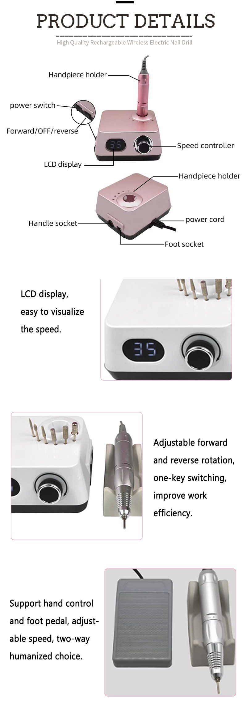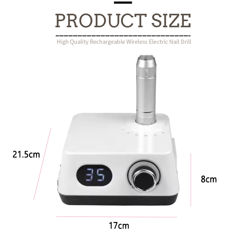 35.000 rpm sürəti olan bu simsiz elektrik dırnaq qazmasının displey dizaynında cəmi bir düymə ilə aktivləşdirmə üçün açma/söndürmə açarı və irəli/geri fırlanma, aşağıda tez doldurma yuvası, yuxarıda dəyişdirilə bilən qazma yuvası və müxtəlif ehtiyacları ödəmək üçün üç mövqeli tənzimlənən sürət var.