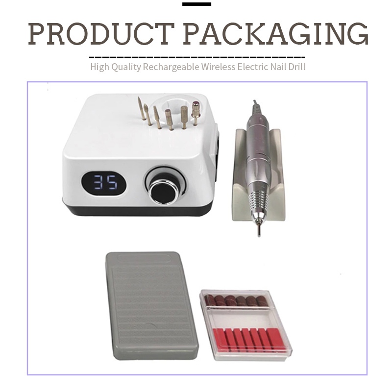 35.000 rpm paketi olan bu simsiz elektrik dırnaq qazmasının tərkibində zımpara qələmi məhsulu, USB şarj kabeli, məhsulun təlimat kitabçası və yüngül və daşına bilən qutu var.